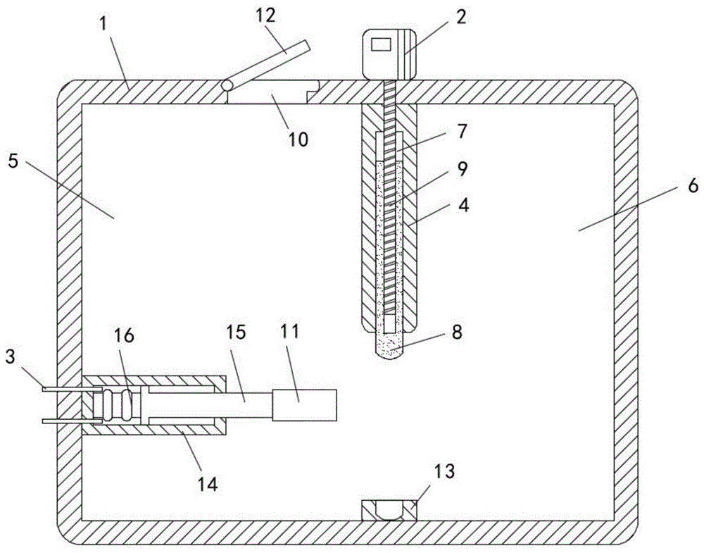圖中:1殼體、2電機(jī)、3冷卻水管、4擋板、5抽真空腔、6熱處理腔、7滑槽、8滑動板、9螺紋桿、10開口、11工作板、12蓋板、13墊圈、14柱形殼、15推桿、16氣囊。